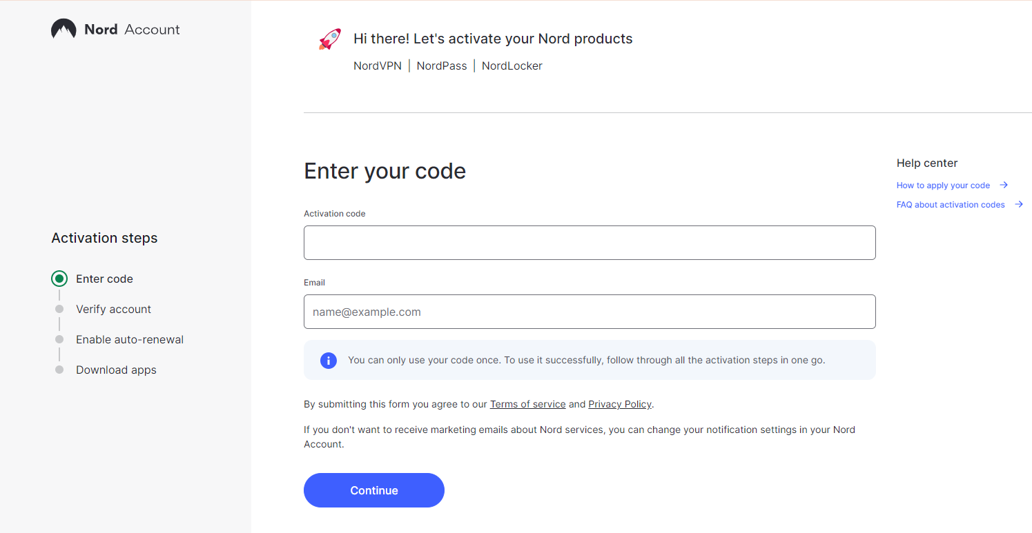 - Vai sul sito di attivazione di NordVPN ed inserisci il codice di attivazione ricevuto mail e l’indirizzo di postra elettronica su cui registrare l’account di NordVPN.